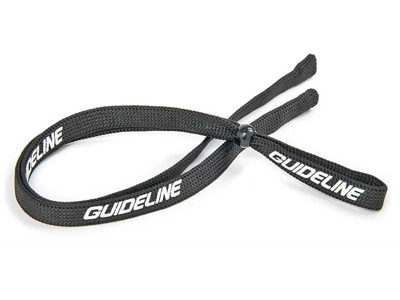 A no frills lanyard or retainer to keep your sunglasses safe and within easy reach when not in use. Black color with white Guideline logos and sliding adjustable clip. Each end of the strap has a circular/tubular form where the end of the temples are mounted.