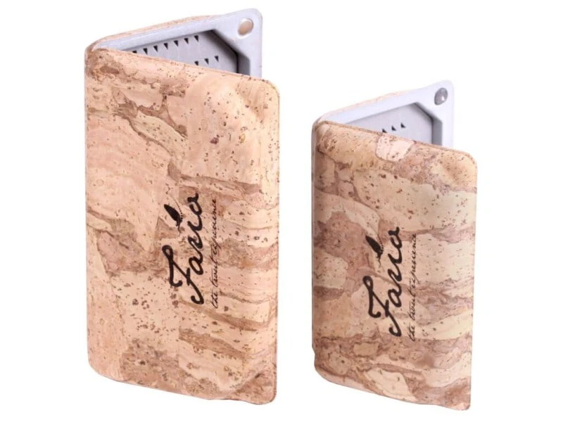 Fario fluebokser med ytterside i kork fra Italia. Laget av slitesterk kork i beste kvalitet, samme type som man bruker i produksjon av sko. Materialet gir et mykt og luksuriøst utseende, boksene er svært lette. I samme serie finnes også Amodou og fortomsstrekker. Alle produkter med Fario logo. Boksene har slit foam for enkel plassering av fluene og egner seg til både tørrfluer og nymfer.