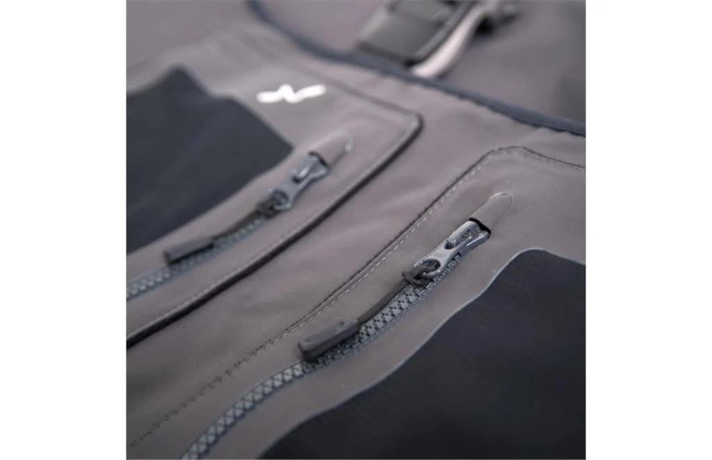 Laxa 2.0 har to store brystlommer med mesh i front og solide vertikale glidelåser. Bak lommene er det varmelommer foret med fleece. Justerbare seler og elastisk vadebelte sørger for gode tilpasningsmuligheter, beltehempen bak har to ulike høyder.