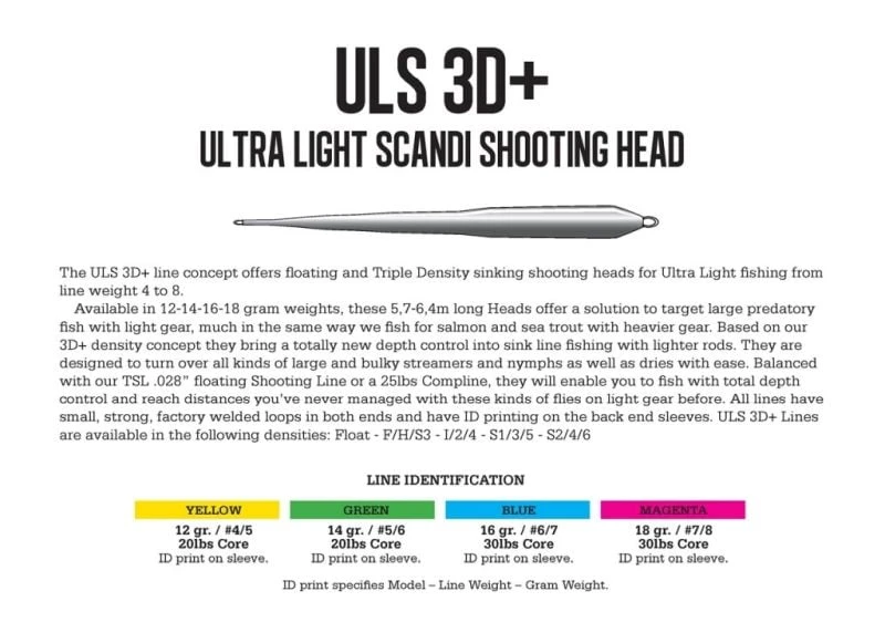 Ultra Light Scandi kommer finnes i to varianter: ULS Multi Tip består av en klump med flytende bakdel (body) med utbyttbare spisser i ulike densiteter som lar deg raskt anpasse fiskedybden etter situasjonen. ULS 3D+ er korte, lettkastde klumper med 3 densiteter som kort og godt er en lettere variant av våre klumper til laksefiske med samme navn.