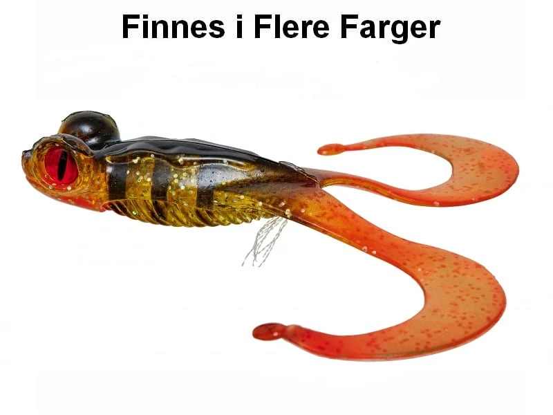 Whether fished on a classic jig head in open water, twitched around weedbeds with a Texas hook or as a trailer on a bladed jig the BULL FROG will attract plenty of interest. The large body shifts plenty of water while oversized eyes and twin tails flutter at the slightest movement add to the attraction. Pike in particular find this irresistible! The slit stomach section traps air and liquid additives but more importantly it helps the lure compress properly in the jaws of an attacking fish leaving the Texan hook free. When fishing the bait weightless, try filling the stomach section with a liquid attractant to add stability. The ribbed stomach section has a softer texture that predators hang on to when they bite giving you extra time to set the hook. Strands of tinsel add extra visual appeal. No fish can ignore the BULL FROG fished across a weedbed! We recommend a wide gape 4/0 Texan hook. Aniseed flavour.