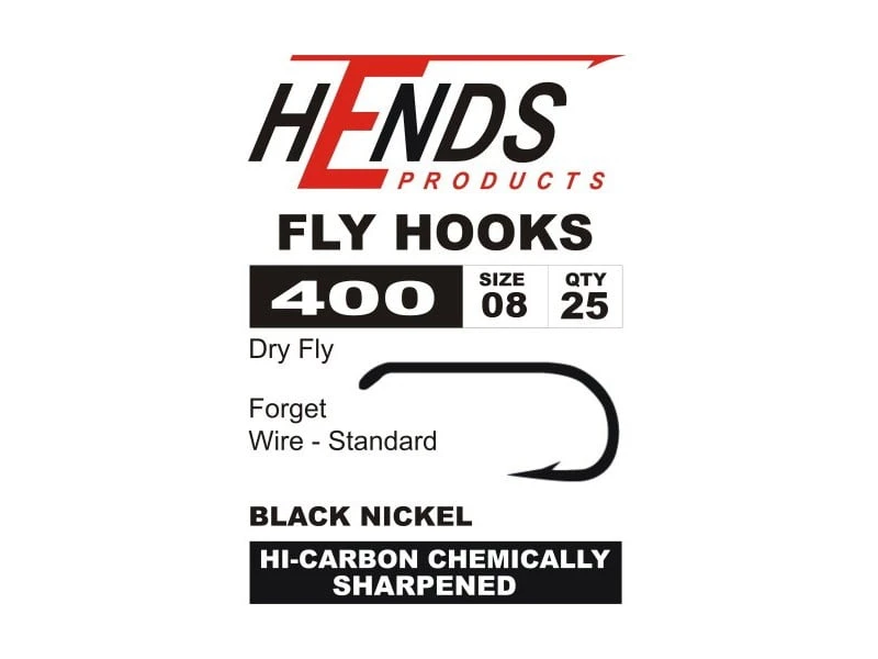 Hends 400 er en kraftigere tørrfluekrok med mothake som brukes til blant annet bustefluer og streaking caddis. Med andre ord en krok hvor flyteevnen allerede er god gjennom bindemateriellet som er brukt og når man trenger litt ekstra styrke. Dette er altså en ypperlig krok til storfisk som tar tørt. Kroken kan også brukes på lette våtfluer. Leveres i størrelsene 08, 10, 12, 14, 16.