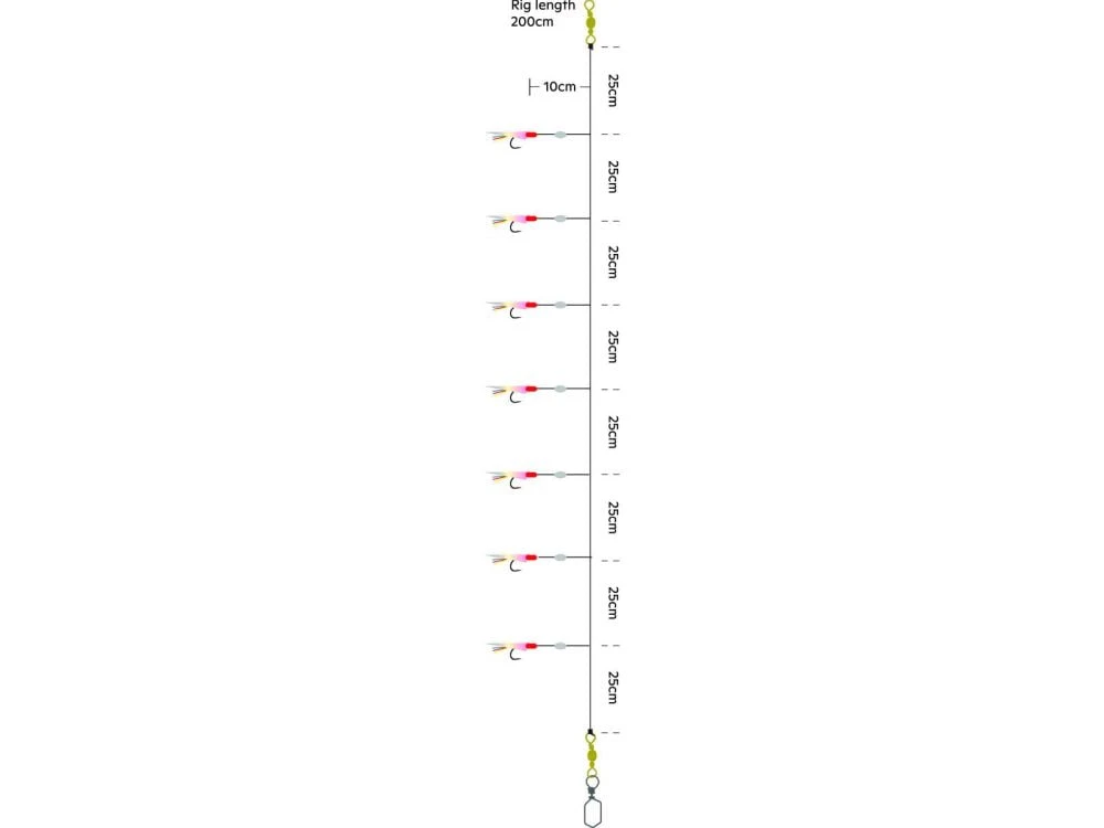 Kinetic MaxCatch sabiki hekla har syv kroker og evnen til å fylle fiskeboksen kjapt. Små og kraftige kroker med forlokkende kunstig fiskeskinn.