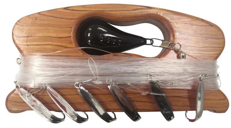 Harpe til makrellfiske. Seks reflexbait og 250 gram søkke.