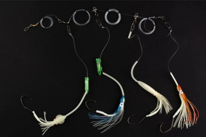 Her er havfiskeriggen som gir deg mange valg. Hovedsnøret er utstyrt med to kraftige swivler med 2,5 meters mellomrom, og med i pakken følger det fire forskjellige opphengere slik at du selv kan avgjøre hva du vil fiske med fra tur til tur. Dette er et allround-paternoster som kan brukes til mange forskjellige arter, men opphengerne som følger med er beregnet på storfisk. Fileter av sild, makrell eller sei funker ypperlig som agn til disse. Husk å bruke elastisk surretråd for å få agnet til å sitte bedre.